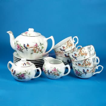 Один только вид этого сервиза навевает воспоминания о вечерах, проведенных в гостях у бабушки. В такие чашки она наливала ароматный чай, подставляя поближе блюдце с вареньем. Пузатый чайник и круглые чашки из фарфора с росписью под гжель – настоящая классика кухонных шкафов любимых бабуль.